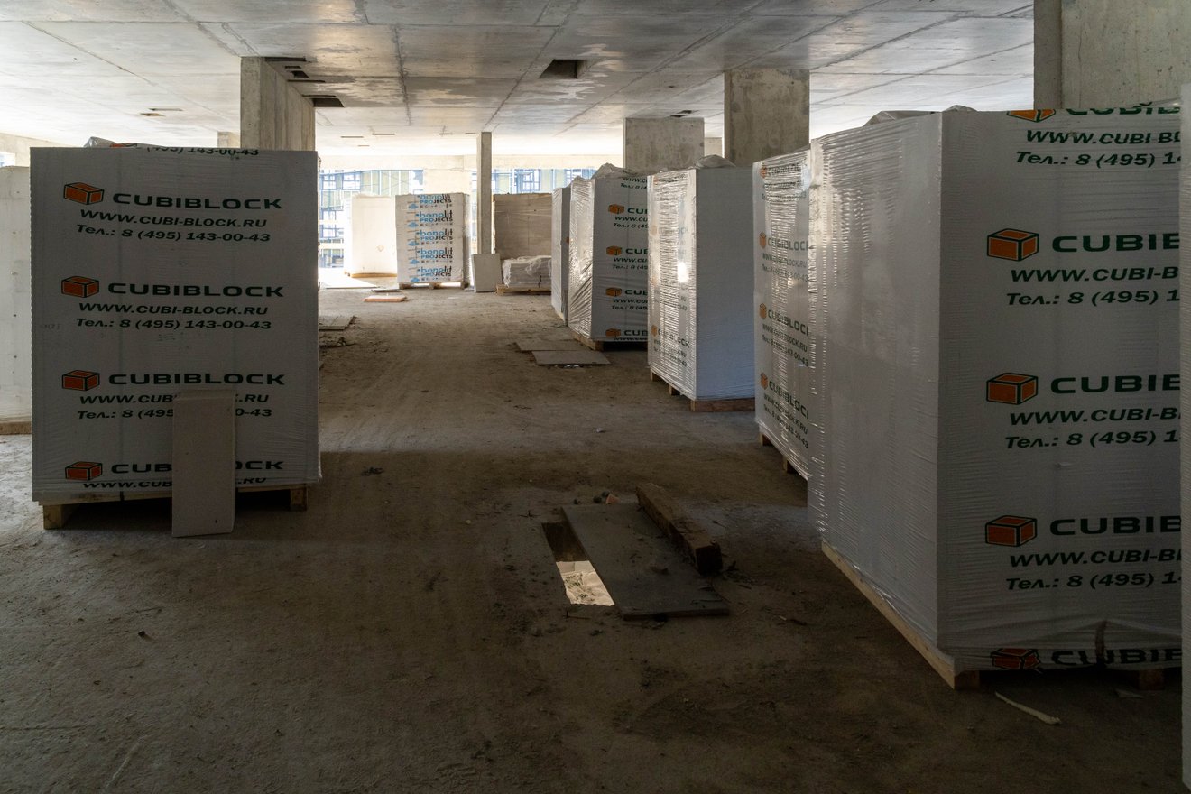 - Продолжаются работы по устройству наружных и внутренних стен. На данном этапе выполнены работы на антресольном этаже, на 5-ом и 4-ом этажах;