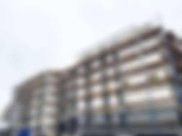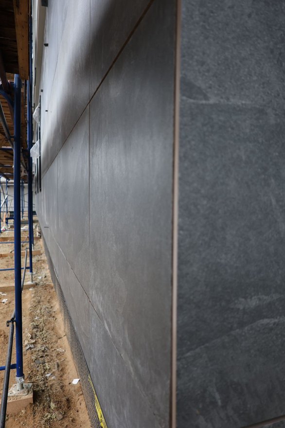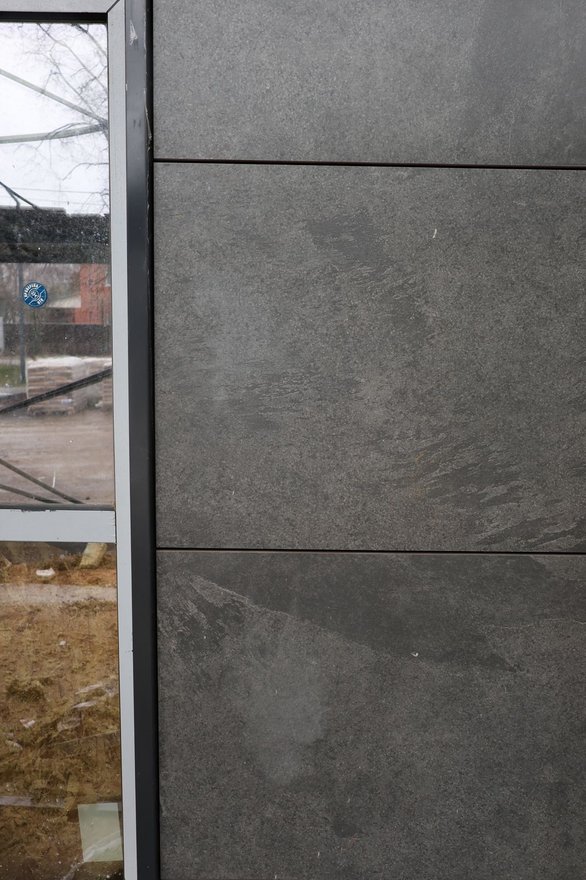 Основой фасада стали крупноформатные плиты Estima — прочный и устойчивый керамогранит в трех оттенках серого. Динамику и выразительность фасада дополнят металлокассеты с текстурой шести благородных пород дерева.