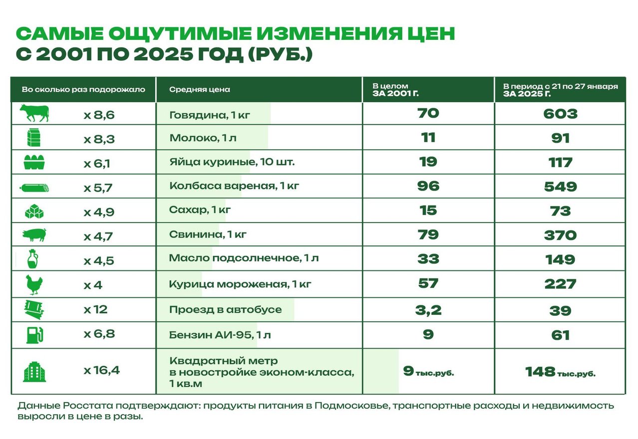 Самый значительный рост цен показывает жилье. В 2001 году квадратный метр в новостройке в Подмосковье стоил 9 000 рублей, а в 2025 — уже 148 000 рублей. Квартиры подорожали в 16 раз!